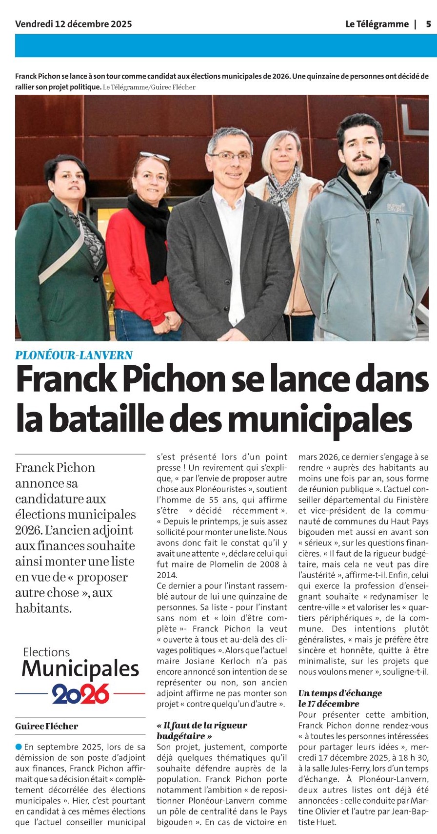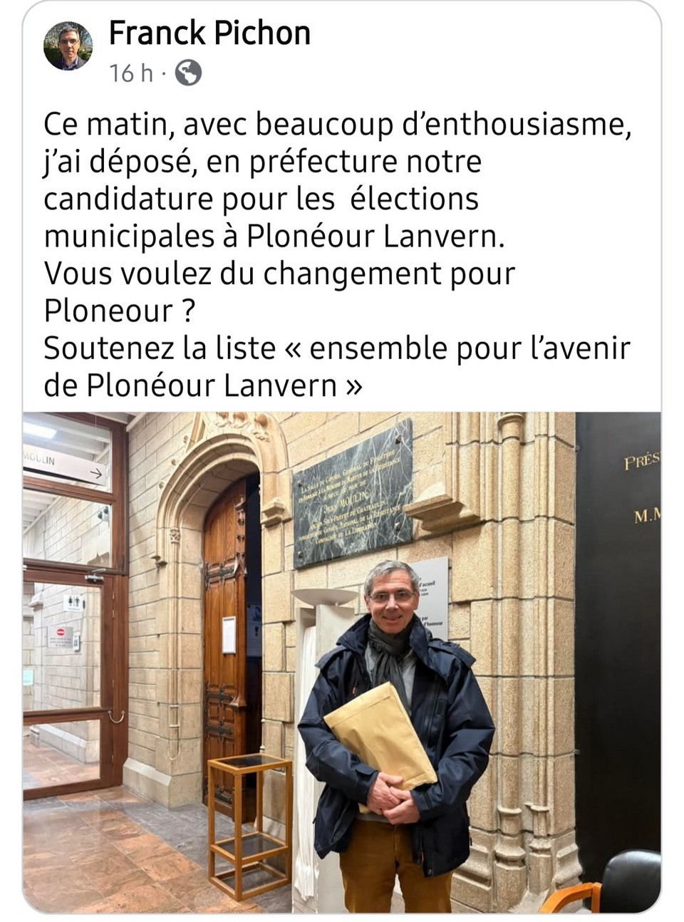 Dans le cadre des élections municipales de mars prochain, notre liste "Ensemble pour l'avenir de Plonéour" a pour ambition de gérer Plonéour-Lanvern avec sérieux et transparence et d'agir en proximité ! Nous souhaitons du changement ! Pour cela ce sera : - Changer pour soutenir et développer